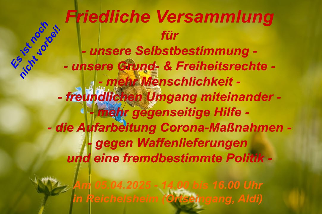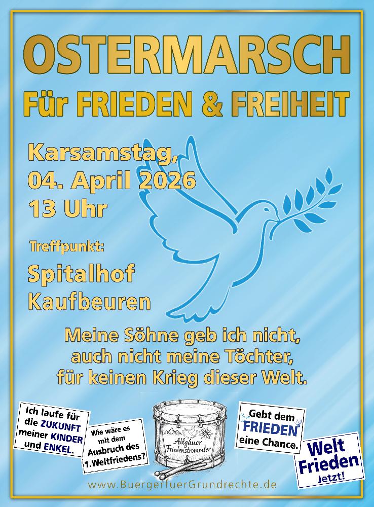 Ostermarsch für Frieden und Freiheit – Kaufbeuren📍 Ort: Kaufbeuren 📅 Datum: Karsamstag, 04. April 2026 🕐 Beginn: 13:00 Uhr (bis ca. 15:00 Uhr) 🎯 Thema: Frieden, Freiheit, wahre Demokratie und Selbstbestimmung Am Karsamstag gehen wir in Kaufbeuren gemeinsam auf die Straße. Nicht leise, nicht angepasst – sondern klar, entschlossen und sichtbar. Begleitet wird der Ostermarsch von den Allgäuer Friedenstrommlern, die mit ihren Rhythmen ein kraftvolles Zeichen für Zusammenhalt und Frieden setzen. Unser Thema ist Weltfrieden. Während weltweit Konflikte angeheizt werden, Waffenlieferungen zunehmen und politische Verantwortung immer häufiger durch Machtspiele ersetzt wird, sagen wir deutlich: Genug davon. Die Menschen wollen Frieden – keinen endlosen Krieg, keine Eskalation und keine Politik gegen die Interessen der Bevölkerung. Der Ostermarsch ist ein Zeichen dafür, dass viele nicht länger schweigen wollen. Wir stehen ein für Frieden, Freiheit, wahre Demokratie und Selbstbestimmung der Völker. Denn jeder Krieg beginnt mit politischen Entscheidungen – und jeder Frieden auch. Darum erheben wir unsere Stimmen. Für Diplomatie statt Waffen. Für Verständigung statt Konfrontation. Für eine Zukunft, in der unsere Kinder in Frieden leben können. Zum Abschluss des Marsches findet eine Kundgebung am Neptunbrunnen statt. Dort wird die Prager Deklaration „Macht endlich Frieden“ verlesen – ein eindringlicher Appell an Politik und Verantwortliche weltweit, endlich den Weg zum Frieden einzuschlagen. ✊ Kommt zahlreich und setzt gemeinsam ein sichtbares Zeichen für den Weltfrieden. ✊ Frieden geht uns alle an – und Frieden beginnt damit, dass Menschen ihre Stimme erheben. Für Frieden. Für Freiheit. Für eine Zukunft ohne Krieg. | |
