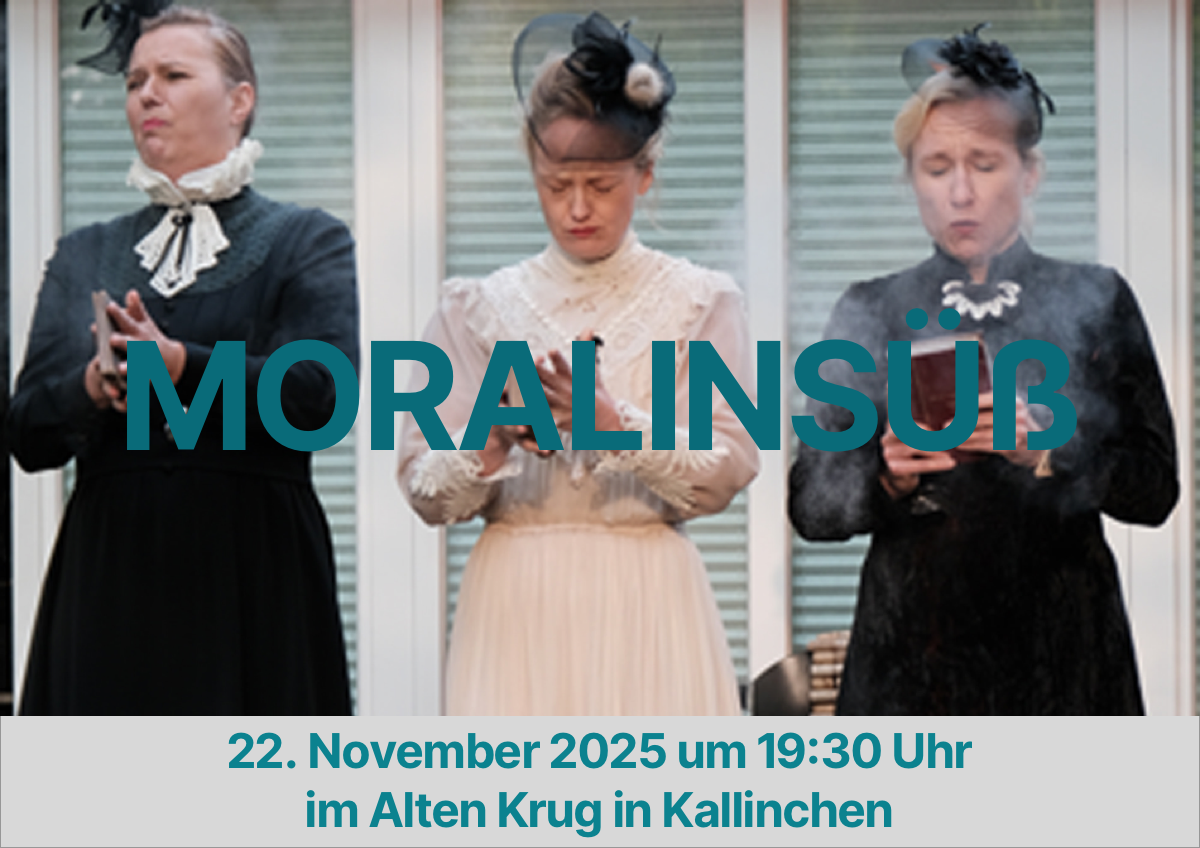 | Steigen Sie ein in das Narrenschiff der Menschheit – Lachen ausdrücklich erlaubt! In der bitter-süßen Komödie MORALINSÜß begeben sich drei elegante Damen auf einen ebenso amüsanten wie scharfsinnigen Streifzug durch 2000 Jahre Geschichte der Sittlichkeit – und entlarven mit Wortwitz, Charme und feiner Ironie das fragile Fundament unserer moralischen Maßstäbe. Darf man das? Sollte man nicht? Oder war das früher vielleicht sogar erlaubt? In der bitter-süßen Komödie MORALINSÜß begeben sich drei elegante Damen auf einen ebenso amüsanten wie scharfsinnigen Streifzug durch 2000 Jahre Geschichte der Sittlichkeit – und entlarven mit Wortwitz, Charme und feiner Ironie das fragile Fundament unserer moralischen Maßstäbe. Ob Goethe, Büchner, Molière oder andere große Denker – sie alle liefern die geistige Munition für einen parodistischen Reigen aus Szenen, Gedichten und Musik. In kunstvoll inszenierten Momenten begegnen dem Publikum die kleinen und großen Verfehlungen der Menschheit, deren Bewertung sich – wie die Zeiten selbst – stetig wandelt. Was gestern tugendhaft war, ist heute lächerlich. Was heute als unanfechtbar gilt, könnte morgen schon zur moralischen Fußnote werden. Und übermorgen? MORALINSÜß ist eine scharfzüngige Reise durch moralische Moden und gesellschaftliche Konventionen, ein kabarettistisch angehauchter Theaterspaß mit Tiefgang – humorvoll, nachdenklich und herrlich zeitlos. Steigen Sie ein in das Narrenschiff der Menschheit – Lachen ausdrücklich erlaubt! | |