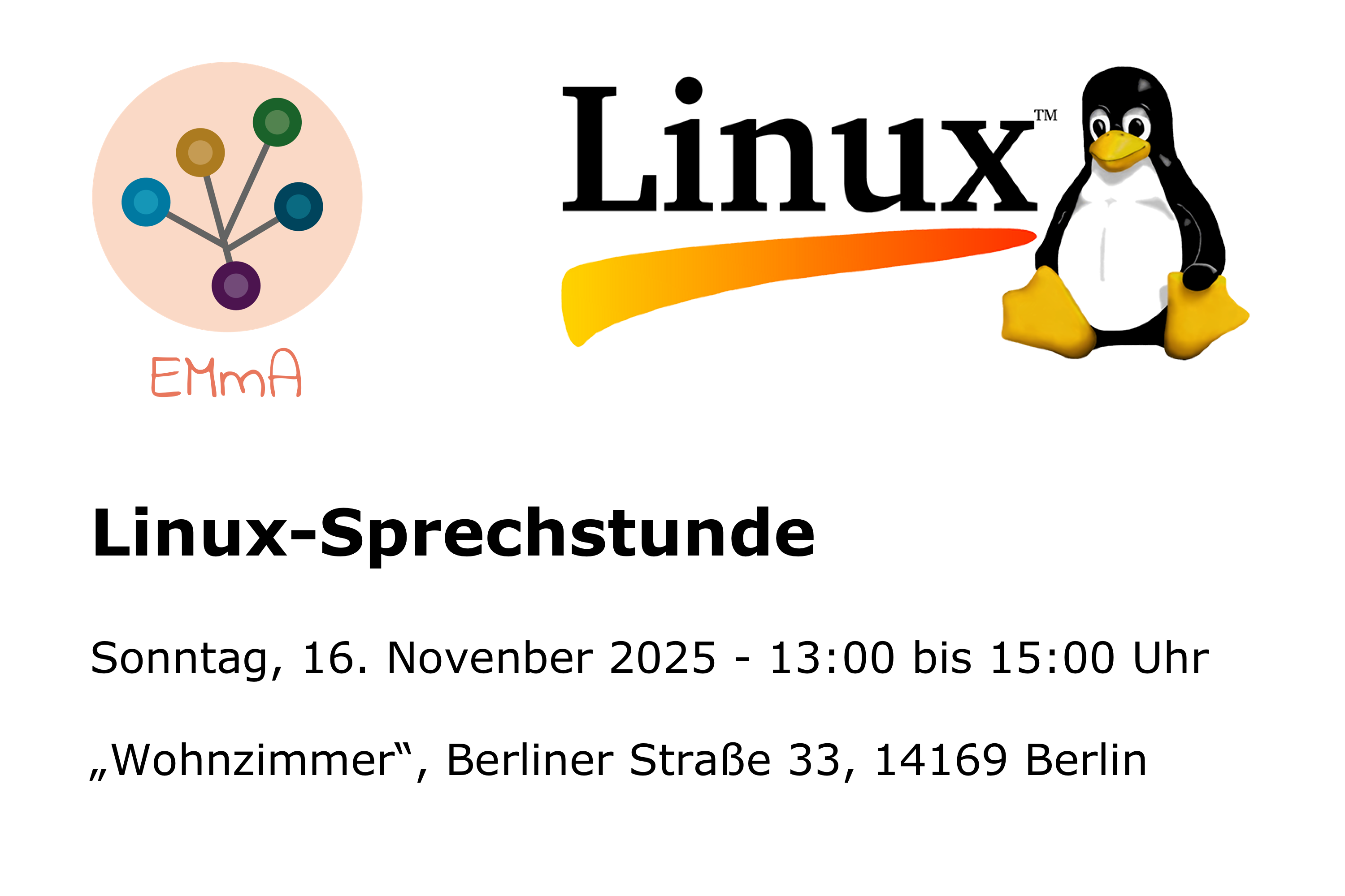 | Die Linux-Sprechstunde findet vor dem Schwurbel Café statt, das von 15:00 bis 18:00 Uhr stattfindet. n nBitte meldet Euch beim Schwurbel Café für die Linux-Sprechstunde an, die Plätze sind sehr limitiert: n nhttps://emma-events.de/?953162767405 | |