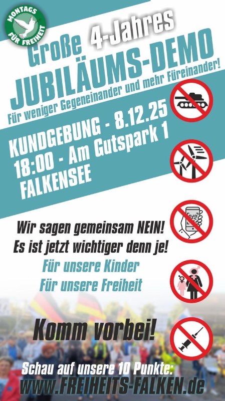 stehen für: - die bedingungslose Einhaltung aller Grundrechte - sofortigen Waffenstillstand und Diplomatie statt Waffenlieferungen und Kriegstreiberei - das Grundrecht auf Barzahlung und das Recht auf ein analoges Leben - die Bewahrung des Mittelstands vor Zerschlagung und Deindustriealisierung - eine Politik frei von Lobbyismus und Korruption - die vollständige und unabhängige Aufarbeitung der Corona-Maßnahmen auch eingetragen in: https://t.me/MontagsspaziergaengeBB/22 auf https://www.berlin.de/polizei/service/versammlungsbehoerde/versammlungen-aufzuege/ zu finden unter "Tegel steht auf" | |