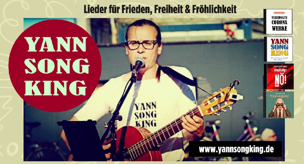 Yann Song King ist ein schwurbelnder Liederkönig, alternativer Alleinunterhalter und Spezialist für Songparodien und gewaltfreie Gassenhauer. Mit seinem breiten Repertoire an Songs wie "Frank hör auf", "Hitze-Tod-Check", "Einweggetränkeflaschenschraubverschluss" und "Absage" bringt er sein Publikum zum Nachdenken, Lachen und Tanzen. Ein Konzert mit Ohrwurmgarantie. Eintritt frei - Spenden erbeten -- | |