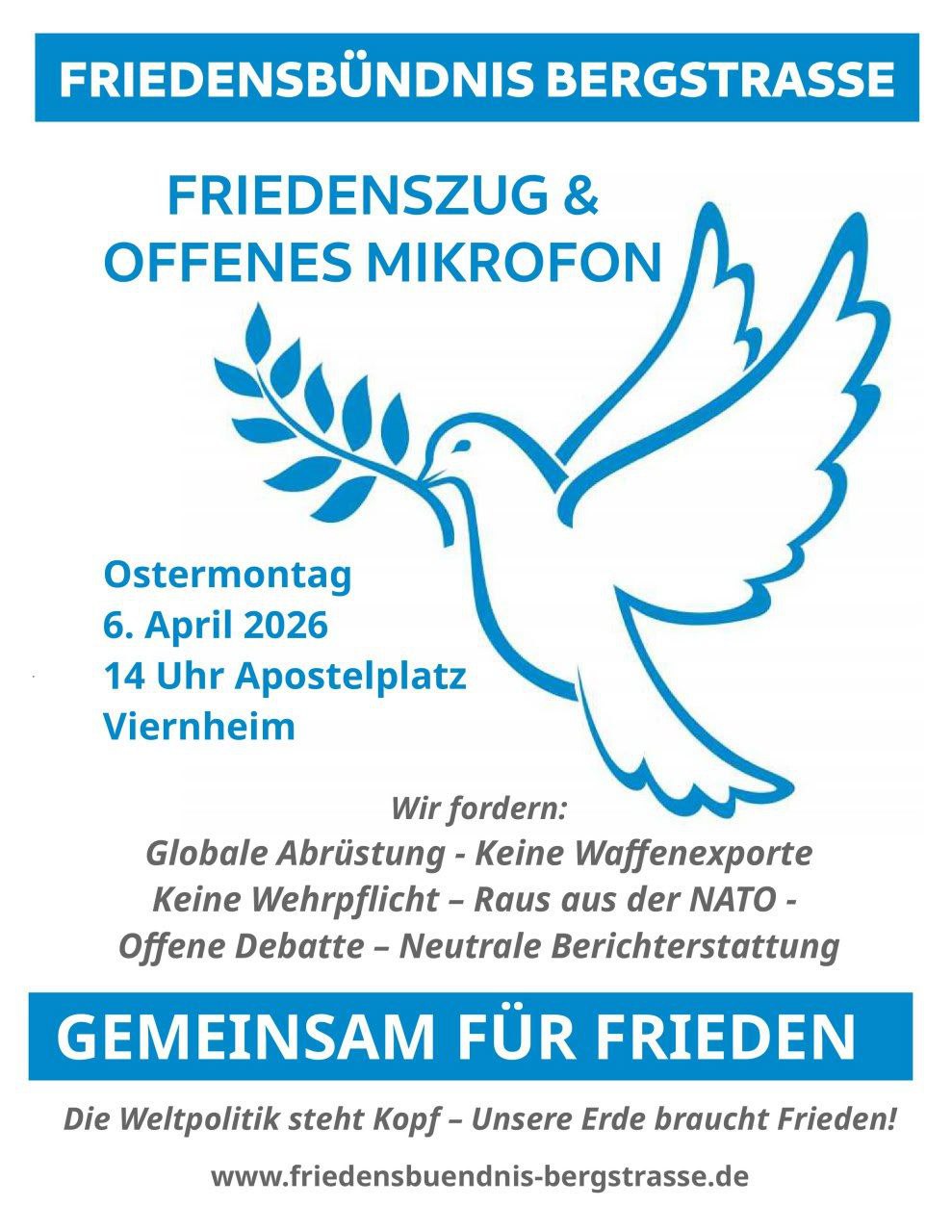 🕊Ostermontag 2026: Gemeinsam für den Frieden auf die Straße🕊 Apostelplatz Viernheim 14 Uhr Friedenszug ca. 15:15 Uhr Ansprachen & offenes Mikrofon 🕊 Für Verhandlungen - Keine Waffenlieferungen in Kriegsgebiete! 🕊 Für Abrüstung - Keine Stationierung von Mittelstreckenwaffen! 🕊 Für eine Begrenzung der Bundeswehr - Keine Wehrpflicht! 🕊 Für eine offene Debatte und neutrale Berichterstattung! (Ausführliche Forderungen hier (https://friedensbuendnis-bergstrasse.de/forderungen/)) „Die Weltpolitik steht Kopf - Unsere Erde braucht Frieden!“ . Sei mit dabei, aktiv für den Frieden! Bitte leite diesen Aufruf weiter, drucke und verteile Flyer - damit wir viele werden und ein sichtbares Zeichen setzten können! Infos & Flyer zum Drucken (https://friedensbuendnis-bergstrasse.de/6-4-26-friedenszug-bergstrasse/) www.friedensbuendnis-bergstrasse.de (https://friedensbuendnis-bergstrasse.de/) #FriedensbuendnisBergstrasse #Frieden #Abrüstung #Menschheitsfamilie | |