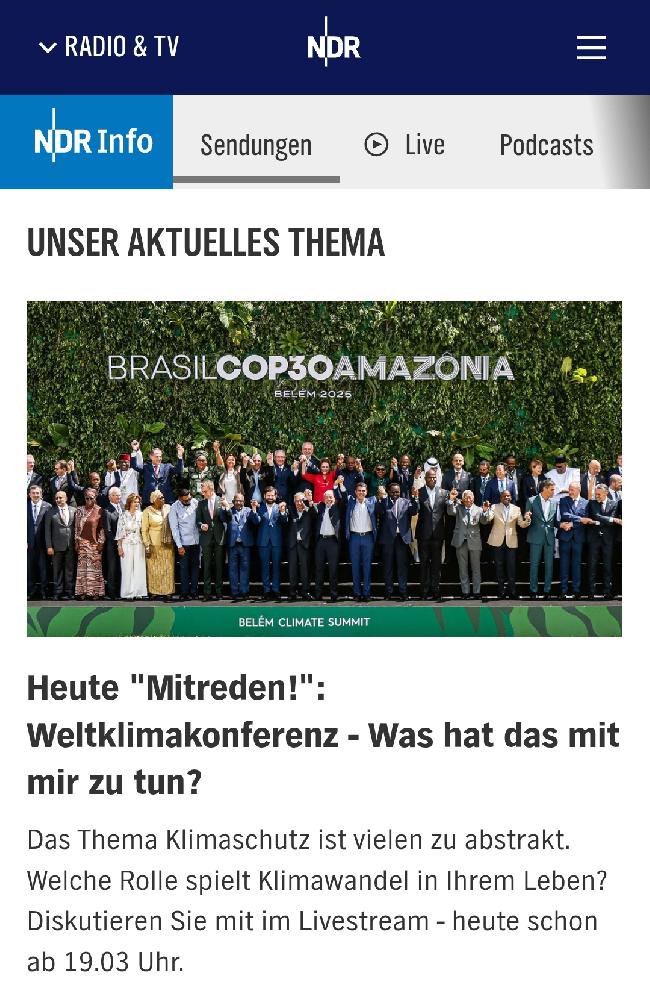 Mitreden - Deutschland diskutiert KLIMAKONFERENZ - Was hat das mit dir zu tun. MITREDEN ist eine Diskussionsrunde, die regelmässig Montags und Domnerstags Abends stattfindet. Normalerweise von 20 bis 22 Uhr. Aber heute ausnahmsweise bereits ab 19.03 Uhr. Die Sendung wird u.a. live im RBB Radio übertragen und man kann während der Sendung auch auf dem Youtube Kanal der Tagesschau Kommentare zu dem jeweiligen Thema schreiben. Auch kann man vor oder während der Sendung Emails zum Thema an die Redaktion schreiben, die dann möglicherweise während der Sendung vorgelesen werden. Auch kritische Stimmen kommen zu Wort. Teilweise sind Politiker oder andere bekannte Menschen in der Sendung zu Gast und nehmen Stellung zu Fragen/Anliegen der Anrufer. | |