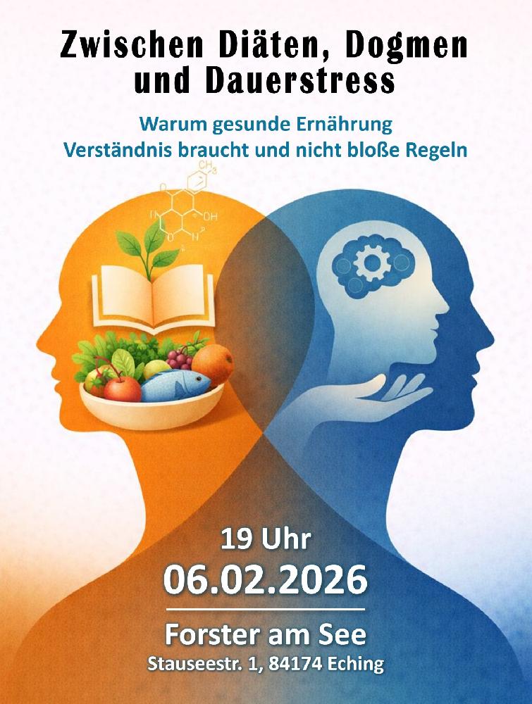 ANMELDUNG UNTER: veranstaltung@bayern-steht-zusammen.de Warum gesunde Ernährung Verständnis braucht und nicht bloße Regeln Möglicherweise beschäftigst Du Dich schon länger mit Deiner Gesundheit und trotz Diagnosen, Behandlungen und Medikamenten bleibt das Gefühl, dass die wirklichen Ursachen noch nicht erreicht wurden. Hinzu kommen Stress, Zeitdruck, widersprüchliche Ernährungstipps und belastende Beziehungen. Ein Alltag, der den Stoffwechsel aus dem Gleichgewicht bringt und Erschöpfung, Übergewicht oder Krankheit fördern kann. Dieser Abend ist unsere Einladung an Dich, innezuhalten, neu hinzuschauen und Orientierung zu gewinnen. Im ersten Teil räumen wir auf: • Warum so vieles, was als „gesund“ gilt, nicht wirkt • Warum Standardempfehlungen scheitern müssen • Was Zucker, Fett und Cholesterin im Körper wirklich tun Im zweiten Teil geht es um die Aktivierung: • Warum Wissen allein nicht reicht • Welche inneren und äußeren Faktoren Veränderung blockieren • Wie Du vom Verstehen ins Handeln kommst – mit Werkzeugen, die mit Deinem Körper arbeiten, nicht gegen ihn. | |